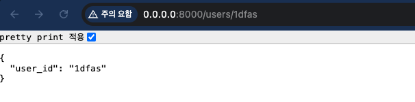만약 chrome이 아닌 terminal에서 실행시킨다면,curl -X GET "http://0.0.0.0:8000/users/123d" curl -X POST "http://0.0.0.0:8000/users/" -H "Content-Type: application/json" -d '{"id": "123d", "passwd": "secret", "name": "John Doe"}'이런 식으로 어떤 명령인지 명시해야한다.