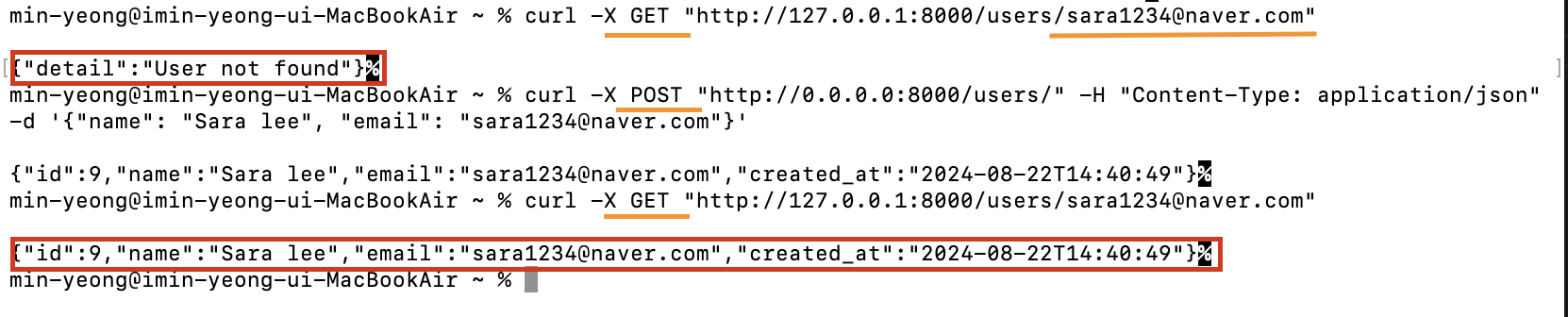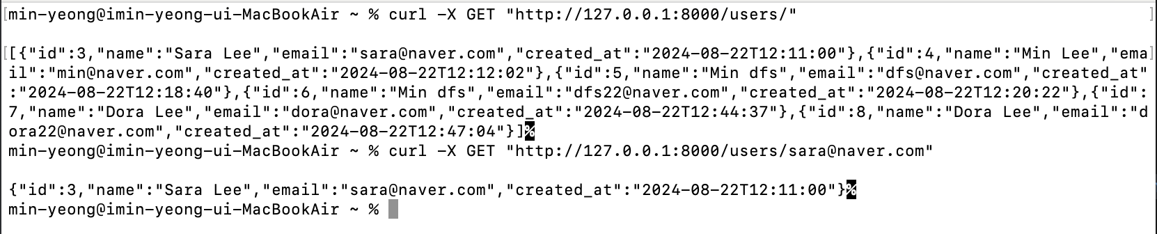 @app.get("/users/", response_model=list[User]) async def get_all_users(): connection = get_db_connection() try: with connection.cursor() as cursor: # 모든 사용자 조회 sql = "SELECT * FROM users" cursor.execute(sql) users = cursor.fetchall() # datetime 객체를 문자열로 변환 for user in users: user['created_at'] = user['created_at'].strftime('%Y-%m-%dT%H:%M:%S') if user['created_at'] else None return [User(**user) for user in users] finally: connection.close() @app.get("/users/{user_email}") async def read_user(user_email: str): connection = get_db_connection() try: with connection.cursor() as cursor: sql = "SELECT * FROM users WHERE email = %s" cursor.execute(sql, (user_email,)) user = cursor.fetchone() if user: return user else: raise HTTPException(status_code=404, detail="User not found") finally: connection.close()- /users/ : 모든 회원 정보 다 불러오기