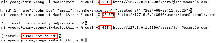 @app.delete("/users/{user_email}") async def delete_user(user_email: str): connection = get_db_connection() try: with connection.cursor() as cursor: sql = "DELETE FROM users WHERE email = %s" cursor.execute(sql, (user_email,)) connection.commit() # 커밋 중요!! if cursor.rowcount > 0: return f"Successfully deleted {user_email}" else: raise HTTPException(status_code=200, detail="User not found") finally: connection.close()실행 결과