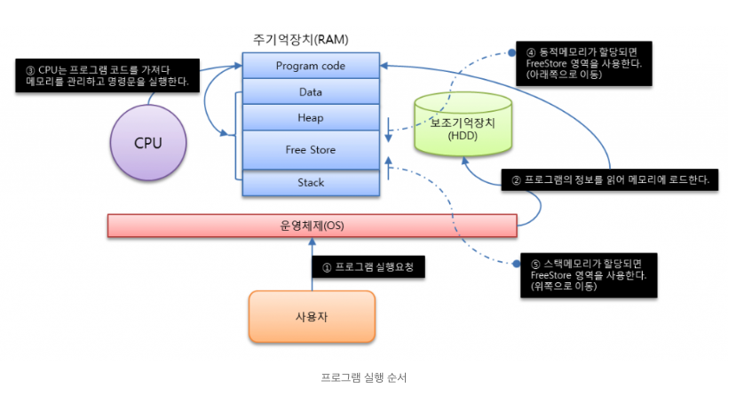 운영체제가 위처럼 보조기억장치(HDD)에서 프로그램 정보를, 메모리 program code 영역에 로드한다.