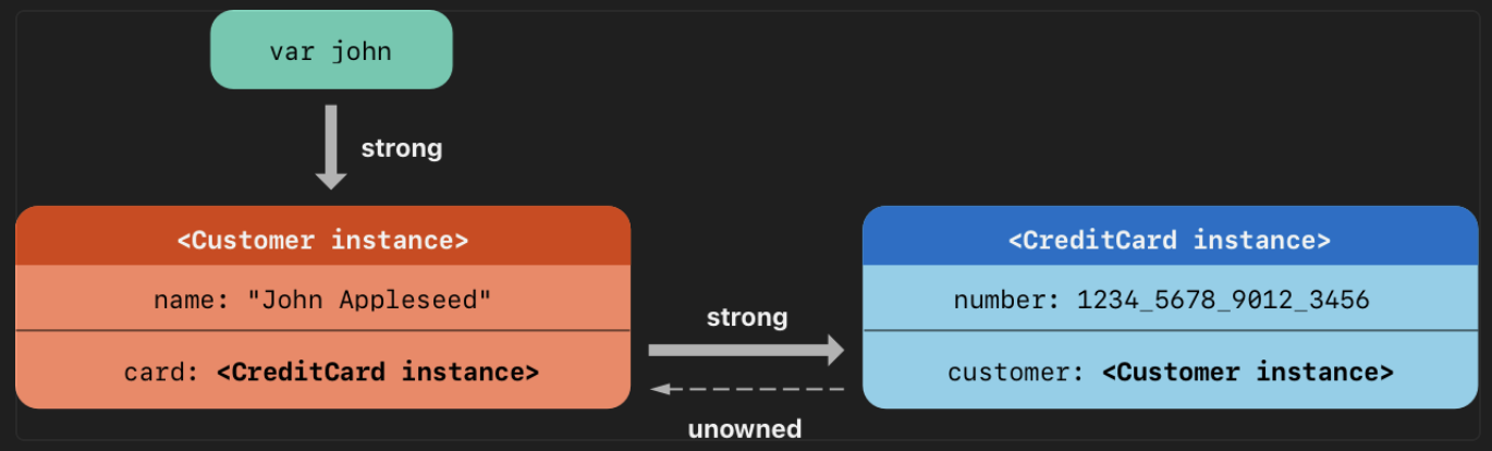 프로퍼티 속성상 nil이면 안되고 & 반드시 강한 참조가 필요할 때 사용한다!class CreditCard { let number: UInt64 unowned let customer: Customer init(number: UInt64, customer: Customer) { self.number = number self.customer = customer } deinit { print("Card #\(number) is being deinitialized") } } class Customer { let name: String var card: CreditCard? init(name: String) { self.name = name } deinit { print("\(name) is being deinitialized") } } var john: Customer? john = Customer(name: "John Appleseed") john!.card = CreditCard(number: 1234_5678_9012_3456, customer: john!)