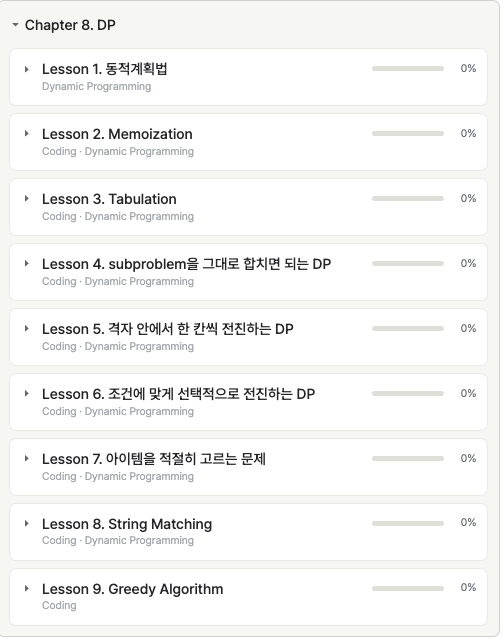 하지만 문제를 풀면서도, 이런 DP 유형은 잘 하지만, 어떤 유형은 잘 모르는데.... 라는 생각이 든 경우들 다들 있으시죠..?(저만 있는거 아니져?..ㅎ)잘 못푸는 유형을 찾으려면 여러 문제를 풀어보는 경우밖에 없었죠...ㅜ 문제를 다 읽어봐야하구요!!이 경우를 코드트리는 알아서 긁어주면서, 코딩테스트에 자주 출제되는 DP의 유형을 세분화 해 알려줍니다!