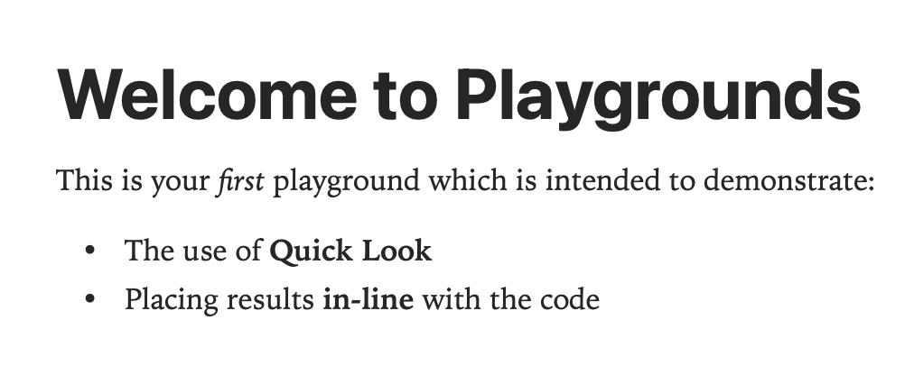 /*: # Welcome to Playgrounds This is your *first* playground which is intended to demonstrate: * The use of **Quick Look** * Placing results **in-line** with the code */위와같이 주석에 마크업 처리를 한 것을 Raw markup 형식이라고 한다.
